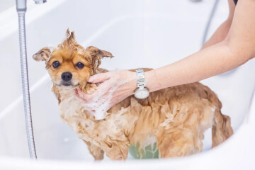 2. Washing with a moisturizing shampoo, thoroughly rinsing until the coat is squeaky clean.