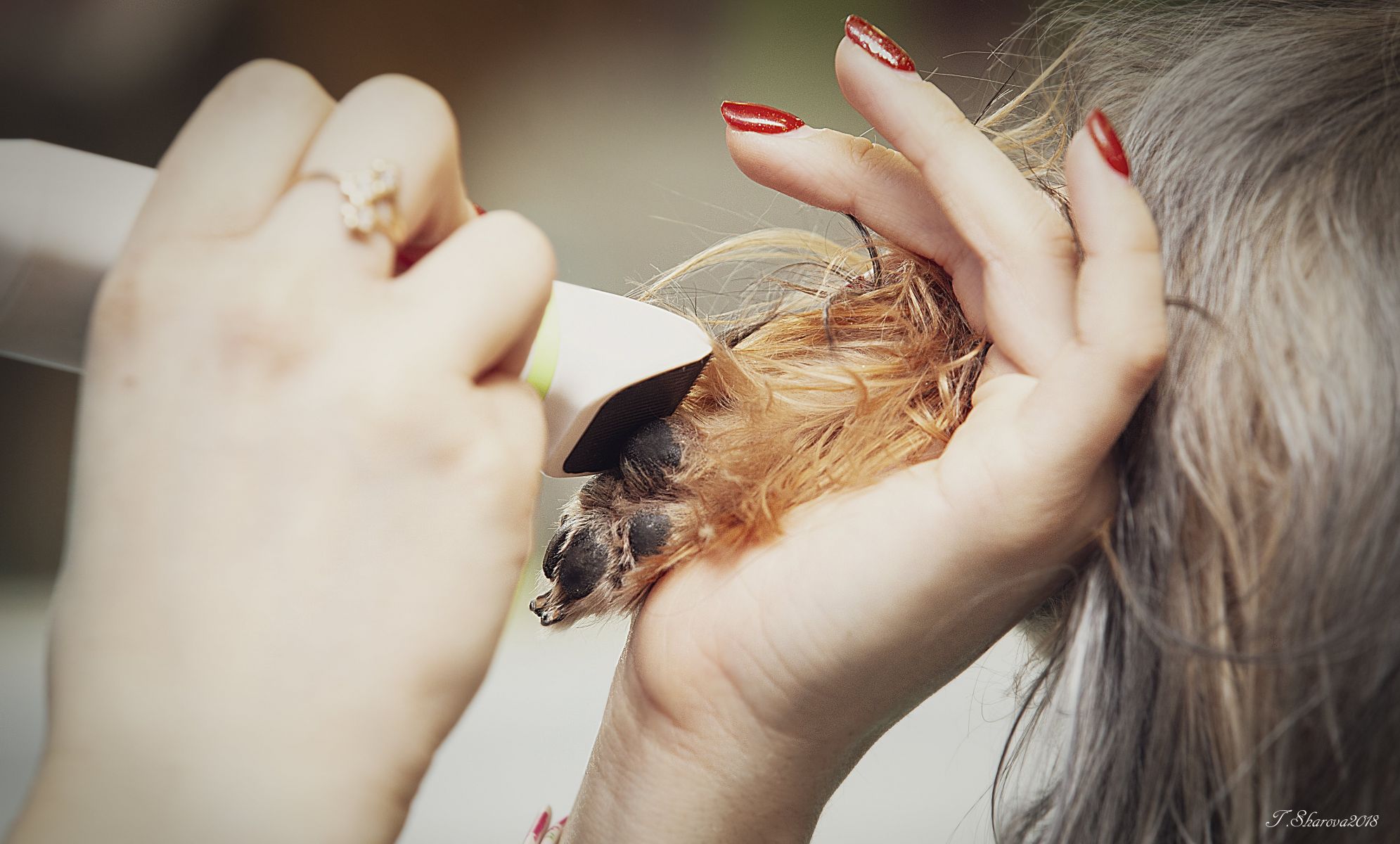 4. Spraying with an anti-static spray and brushing out dead undercoat while drying each strand of fur.